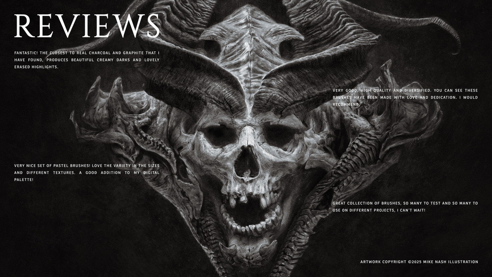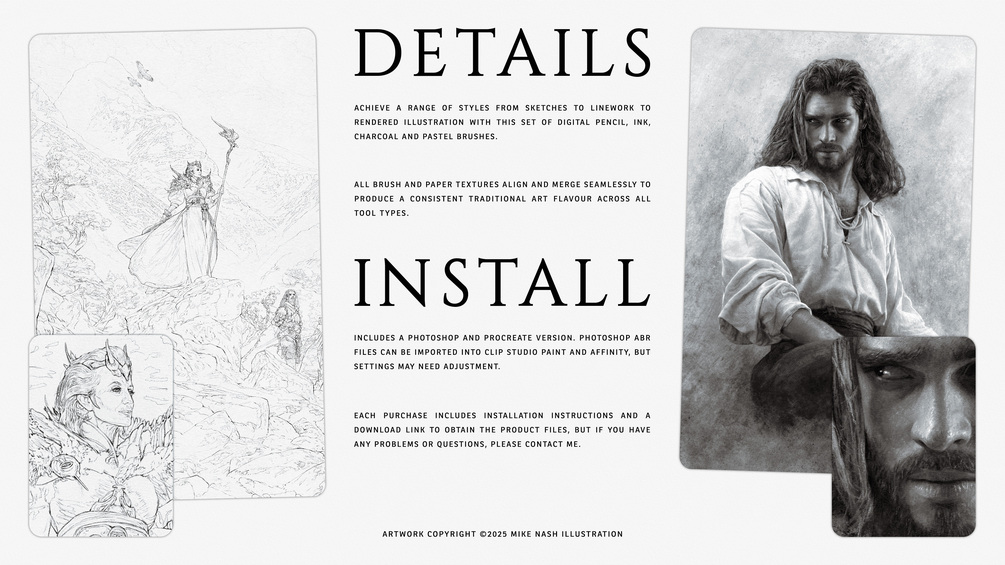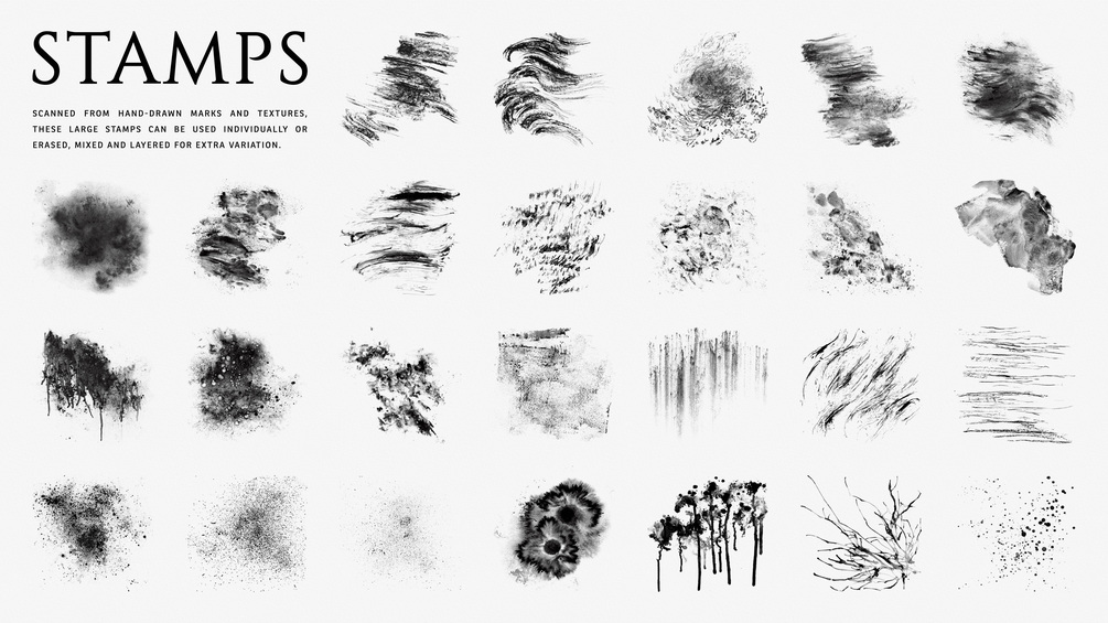 A collection of 150 handcrafted brushes for Photoshop (CS6 and CC) and Procreate*. This pack features graphite, charcoal, pastel, pen and ink brushes, erasers, blenders and a variety of powder, acetone and ink effects alongside a custom paper surface and overlay. All tools, textures and styles were created from real media to infuse the variety and flavour of traditional drawing methods into your digital art creations.